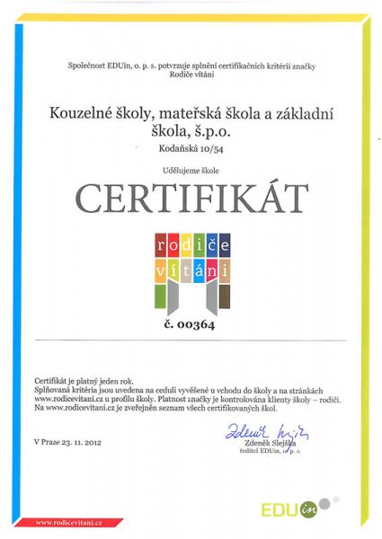 Za vstřícnou komunikaci s rodičovskou veřejností byl škole udělen certifikát Rodiče vítáni. Více informací na http://www.rodicevitani.cz/.